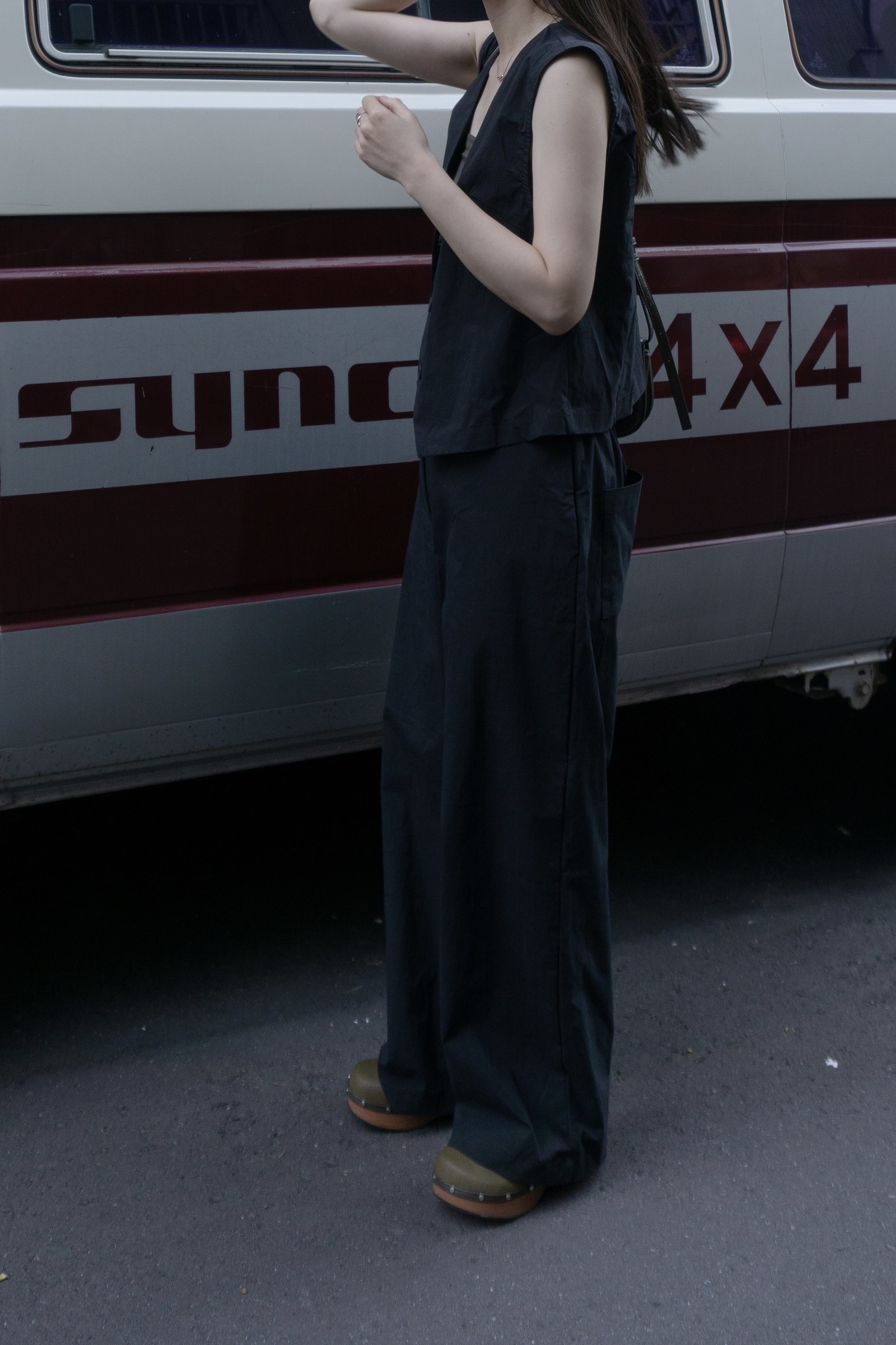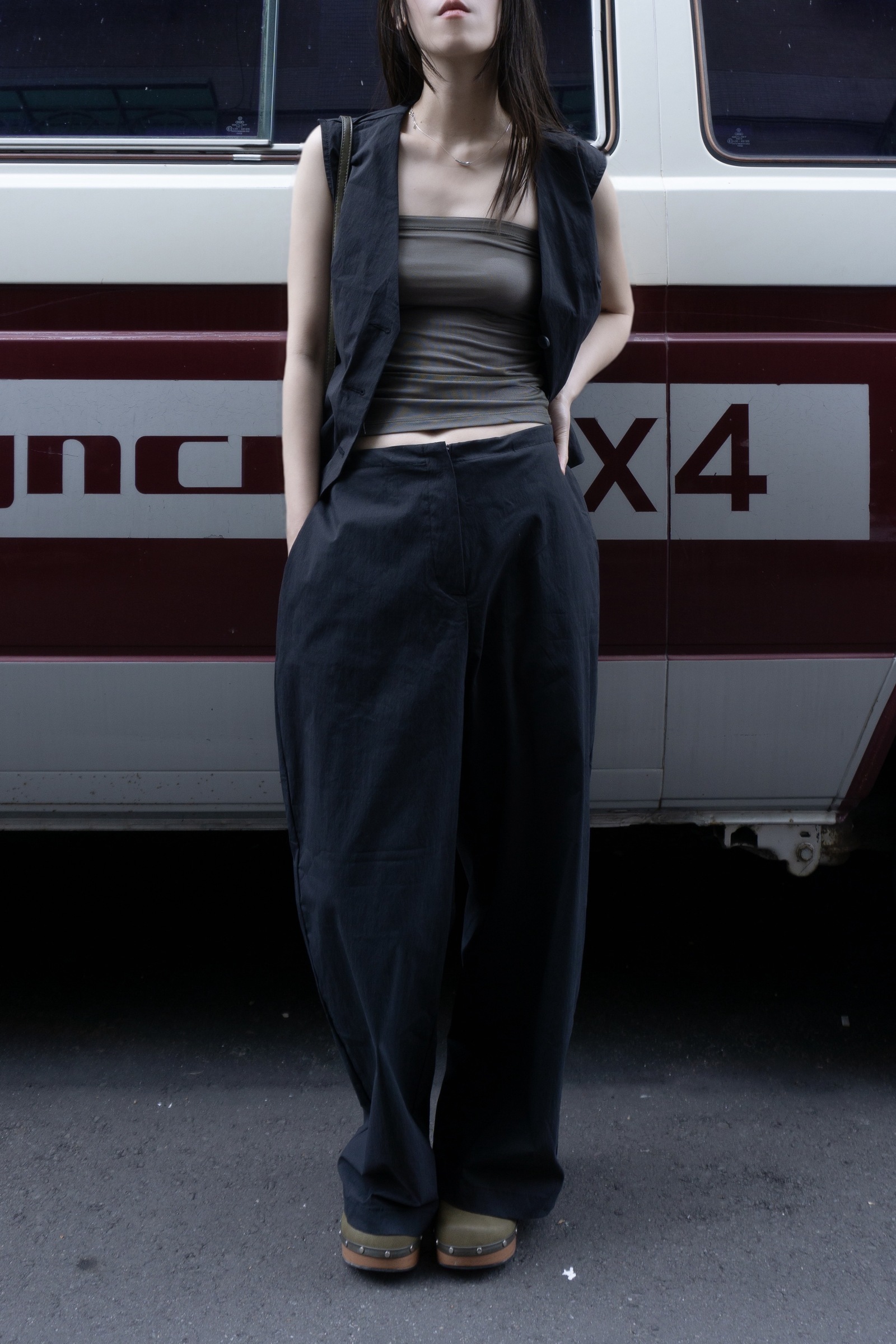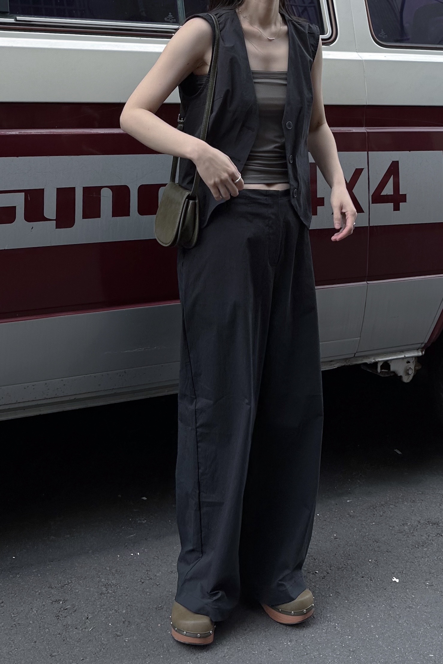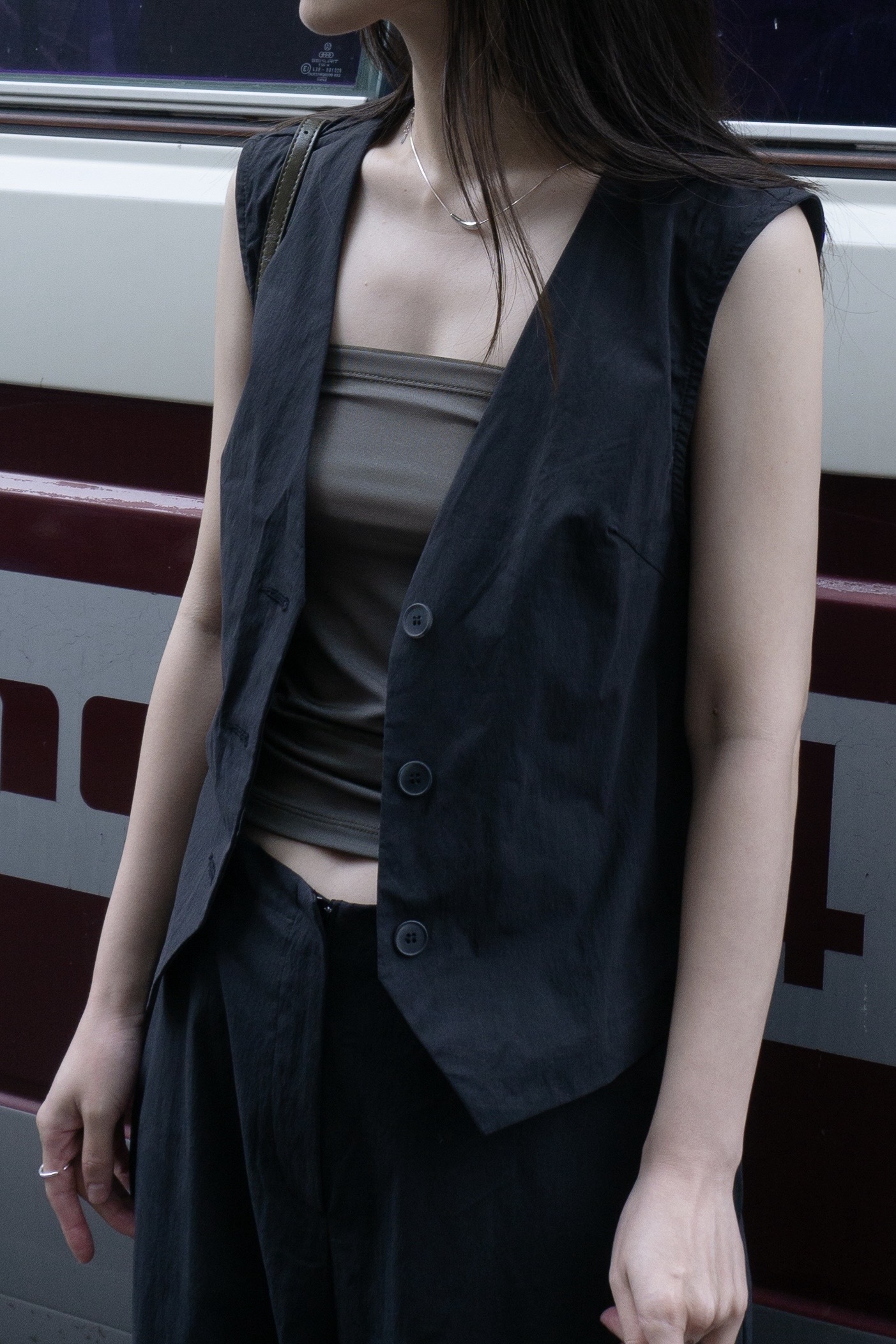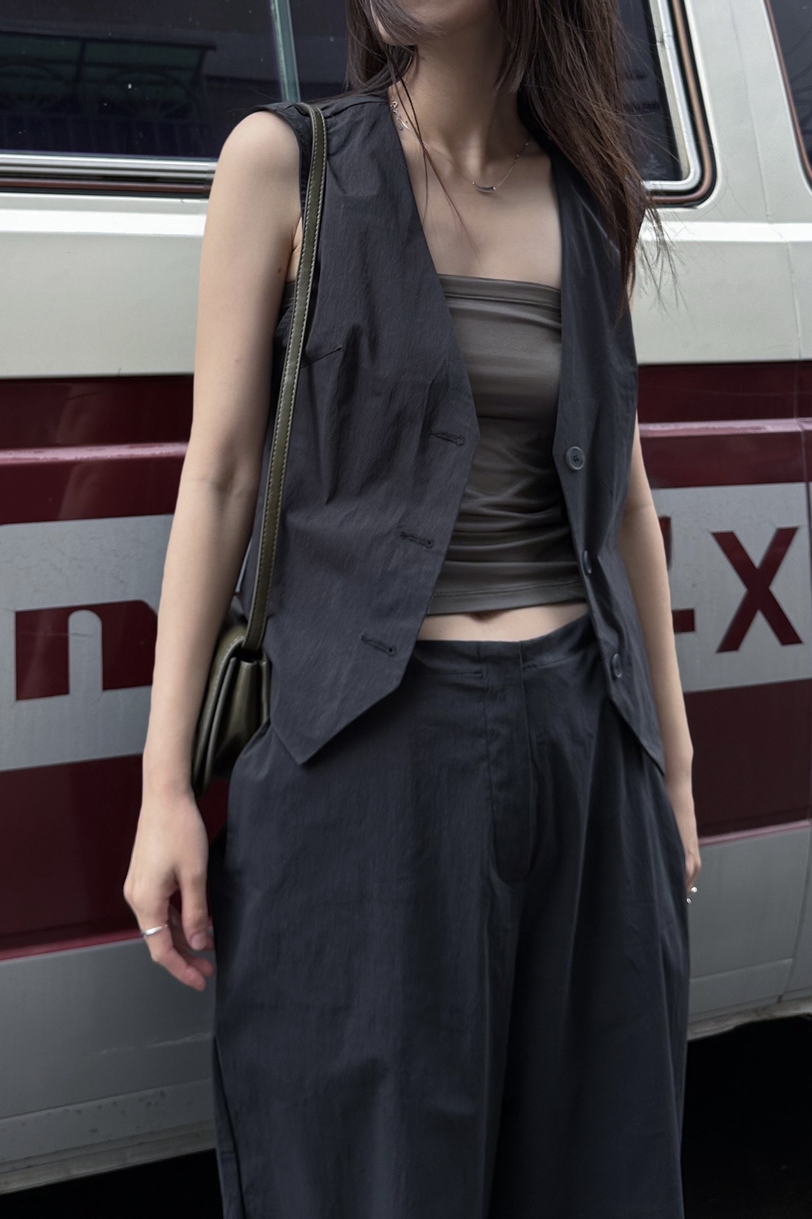 水洗挺料背心寬褲套裝 2色 黑